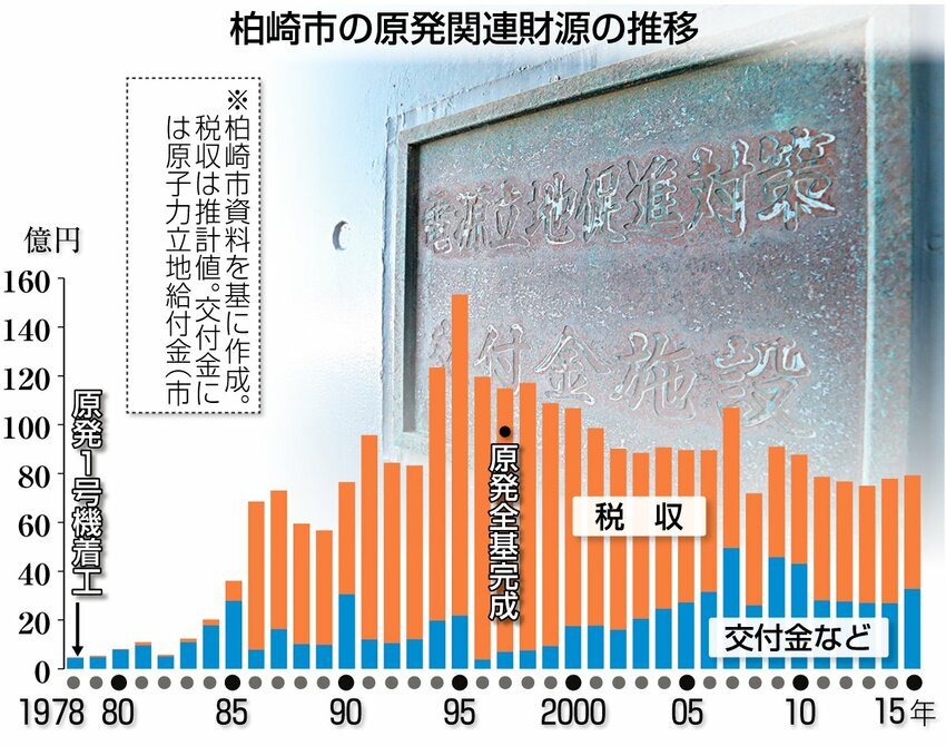柏崎刈羽原発の1号機着工から38年。国や東電などから交付金、税金として新潟県柏崎市の財政にもたらされた恩恵は計2838億円に上る。
