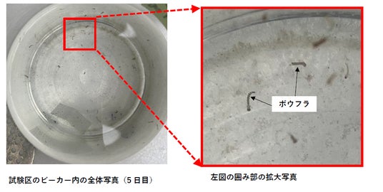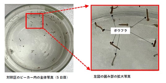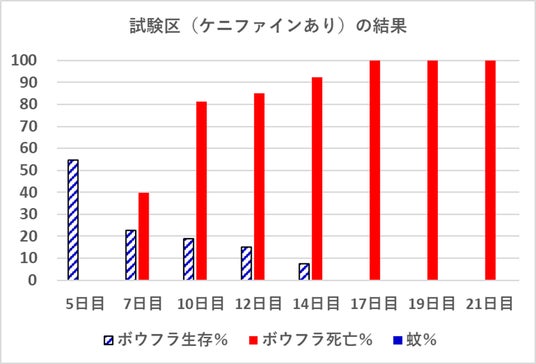 以上のように、対照区(ケニファインなし)では、試験開始後10日目から蚊の羽化が始まり、21日目ではボウフラ累積数のおよそ20%が蚊の成虫となった。一方、試験区(ケニファインあり)では、試験開始後17日目にはボウフラ死亡率が100%となり(全数、蚊の成虫には至らず)、ケニファインは、蚊の発生を予防する効果があることが確認された。