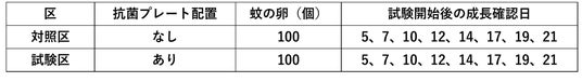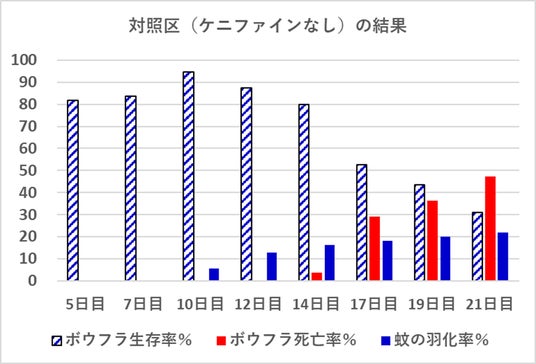 ・試験結果:試験期間中に孵化したボウフラ累積数は、対照区で55匹、試験区で53匹であった。各区のボウフラ累積数を基準に求めたボウフラの生存率、ボウフラ死亡率、蚊の羽化率の経過結果を以下に示す。