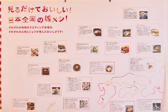 Wedding Park 2100プロジェクトに賛同している企業から募集した、全国の婚メシたちをレストランにパネルで展示。地域ならではの「まちを、もっと幸せにする婚メシ」をご紹介しました。