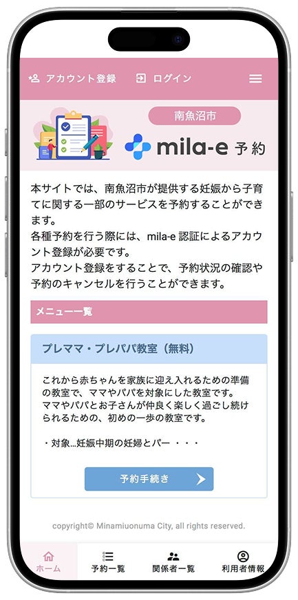mila-e おやこ手帳 TOP画面の「オンライン予約」からアクセス後、お持ちのmila-e認証アカウントにてログイン、利用者情報を入力し予約を行ってください。
