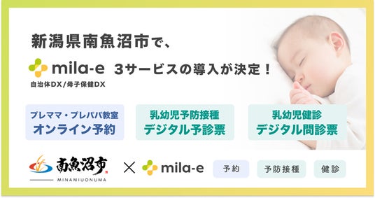 株式会社ミラボ(本社:東京都千代田区、代表取締役:谷川一也、以下「ミラボ」)は、オンライン予約サービス「mila-e 予約」、乳幼児予防接種デジタル予診票「mila-e 予防接種」、乳幼児健診デジタル問診票「mila-e 健診」が新潟県 南魚沼市に導入され、提供を開始しました。