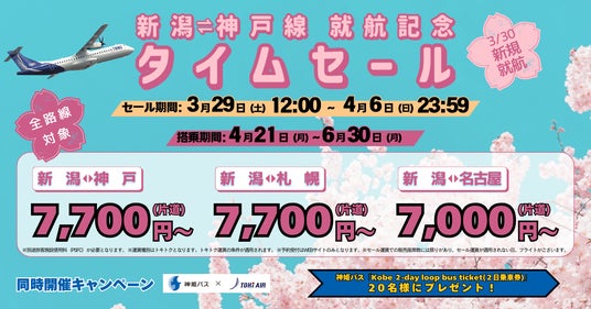 新潟拠点の地域航空会社トキエア株式会社(本社:新潟県新潟市 代表取締役:長谷川政樹、以 下トキエア)は、新潟=神戸線の就航を記念して、2025 年 3 月 29 日(土)~4 月 6 日(日)限 定で神戸線を含む、全路線対象のタイムセールを実施することをお知らせいたします。なお今回 のタイムセールでは、2025 年 4 月 21 日(月)~6 月 30 日(月)に運航する便を対象としています。