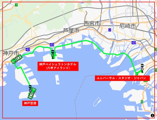 神戸空港からユニバーサル・スタジオ・ジャパン方面へは、みなと観光バス61系統が所要時間約50分で運行しています。