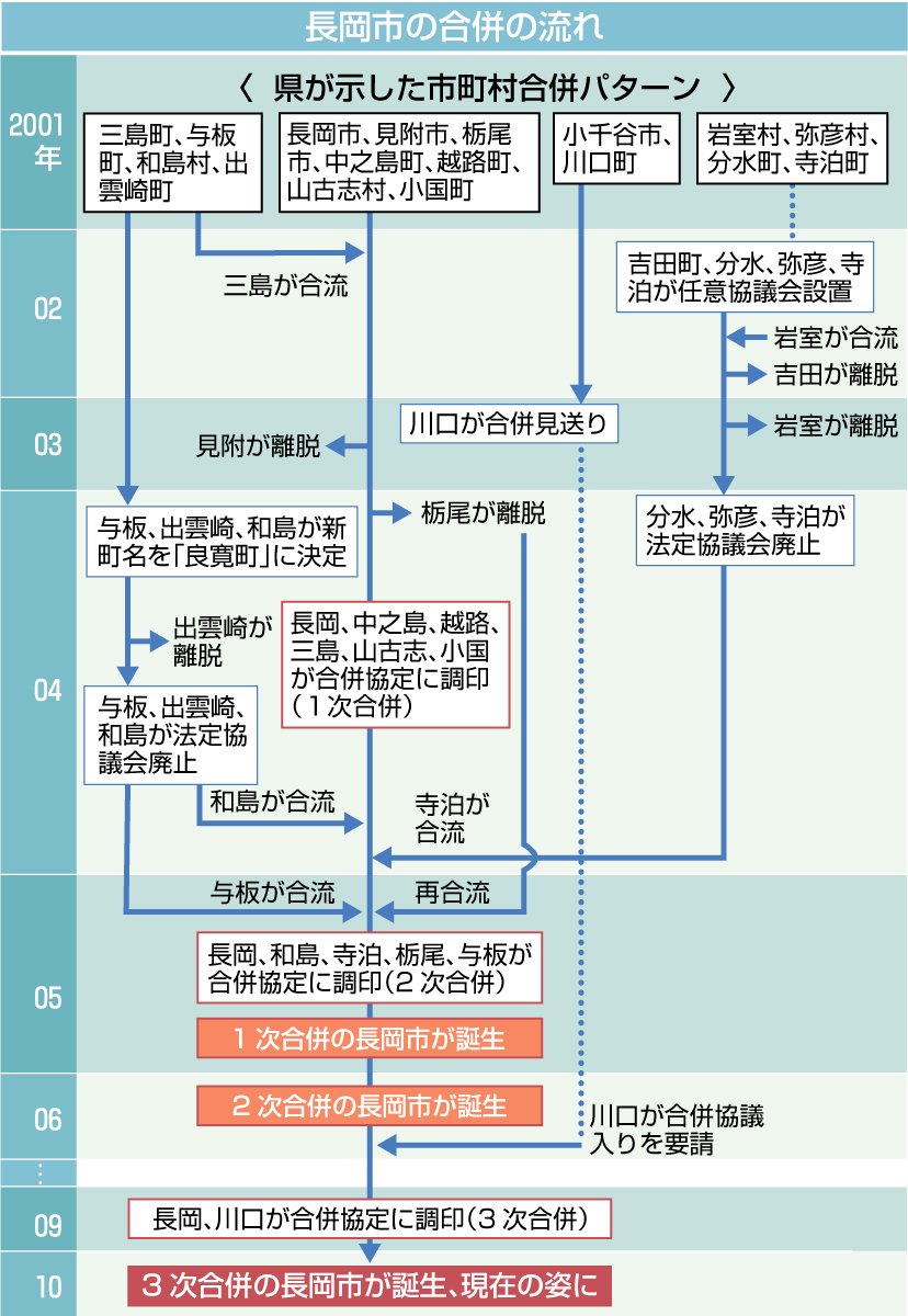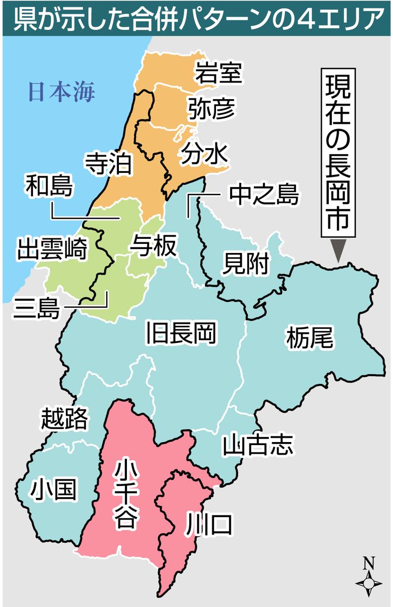 01年12月には、県パターンと重なる長岡市、見附市、栃尾市、中之島町、越路町、山古志村、小国町による合併研究会が発足した。県パターンで与板町、和島村、出雲崎町と一緒だった三島町は当初、オブザーバーだったが、住民意向調査で長岡との合併を望む声が多かったことを受け、間もなく正式参加した。