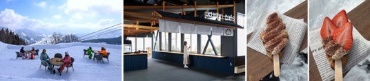 (写真左)今シーズンから登場!この時期限定の『kumo cafe 雪のオープンデッキ』 (写真中)窓からは2,000m級の雪山が一望できる2年目の『kumo cafe カフェエリア』 (写真右)春の雪山観光営業期間限定スイーツ『ティラミス クロッフル』