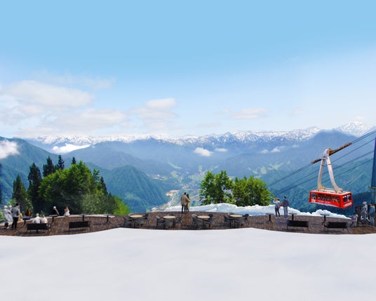 奥には2,000m級残雪の山々の大パノラマ、ふもとには新緑が芽吹く絶景「雪のオープンデッキ」から見える絶景(イメージ)
