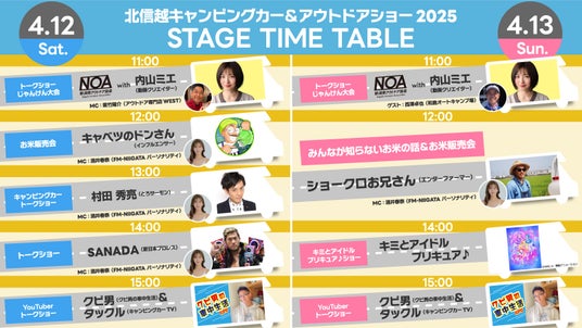 北信越キャンピングカー&アウトドアショー実行委員会(事務局:有限会社カトーモーター、株式会社ブシロードムーブ、株式会社ネオプロジェクト)は、2025年4月12日(土)~4月13日(日)開催する「北信越キャンピングカー&アウトドアショー2025」のステージプログラムを解禁したことをご報告いたします。