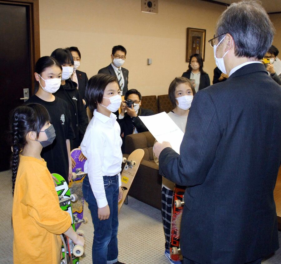 写真=県営(けんえい)のスケートボードパークが設置されることになり、花角英世知事に感謝(かんしゃ)と要望を伝える小中学生(4月、県庁(けんちょう))