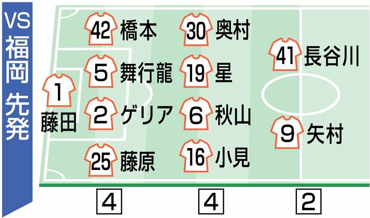 前半はパスミスが目立ち、ピンチを招いた。MF長谷川元希らがシュートを放ったが、福岡の堅い守りに阻止され、互いに無得点のまま試合を折り返した。