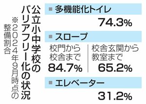 社会 公立小中学校の多機能トイレ整備率74・3%、国の目標届かず 2024年9月時点、バリアフリー化調査 2025/4/4 12:30 全国の公立小中学校のうち、校舎に多機能トイレを整備しているのは2024年9月時点で74・3%に当たる2万325校だったことが、文部科学省の3日までの調査で分かった。前回22年度時点の調査より3・9... 残り920文字(全文:1019文字) ここから先を読むには 続きを読む(会員登録する) 続きを読む(ログイン) 新潟日報朝刊を購読していますか? はい いいえ トップページで最新情報を見る 関連ニュース 貴重な資料を未来へどう残す?マイクロフィルム生産終了へ、県立... 21:45 燕市の工場敷地内の地下水から基準値超の鉛検出、健康被害確認さ... 20:15 特殊詐欺の「かけ子」に勧誘か、男逮捕 「行き先はラオス」など... 19:15 糸魚川のナメコからセシウム検出、基準値は下回る 18:50 児童ポルノ製造容疑で新潟市中央区の男を逮捕、10代女性に裸の... 18:45 盗品と知りながら銅線買い取りか…ベトナム国籍の男を逮捕、新発... 18:10 新潟市西区の飲食店で火災、調理場から出火し壁焦がす 店主の男... 17:45 [不審者情報]新潟市中央区で児童らに握手を求め「家に寄ってい... 14:40 [クマ目撃情報]村上市、新発田市、阿賀町、長岡市、見附市、魚... 14:10 見附市の大平森林公園でクマ目撃…8日まで終日閉園に、9月下旬... 12:45 [戦後80年]直江津捕虜収容所跡の平和記念公園(上越市)開園... 11:45 おいしい記憶を伝えたい…キッコーマンの大津山厚さん出前授業 ... 8:00