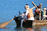 柏崎市軽井川の夢の森公園で、現役のハンターによる「アウトドア塾」が開かれた。参加者は枯れ木を集めて火をおこし、ナイフで肉をさばいて料理するなど、自然の中で生かせるサバイバル術を体験した。
