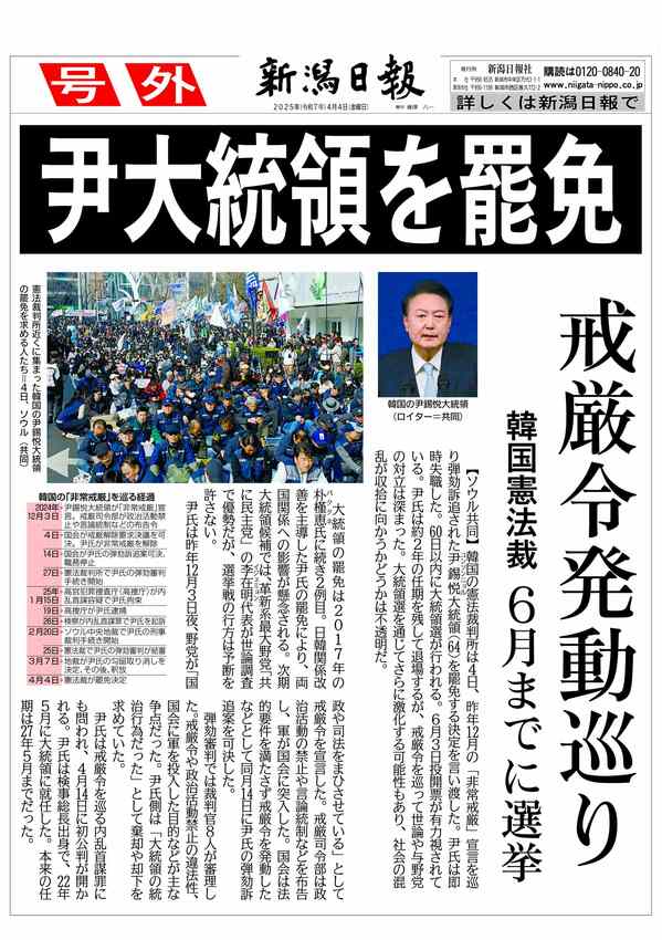 【号外】尹錫悦・韓国大統領を罷免 2025/4/4 12:05 (最終更新: 2025/4/4 12:06) PDFで号外を見る トップページで最新情報を見る 関連ニュース 【号外】新潟県知事が柏崎刈羽原発再稼働を容認 11/21 【号外】日経平均初の5万円台 10/27 【号外】新首相に高市早苗氏、女性で初めて選出 10/21 【号外】燕市の新市長に前市議の佐野大輔氏 10/20 【号外】北信越高校野球・帝京長岡が優勝 10/19 【号外】公明党が連立政権離脱へ 10/10 【号外】ガザ全人質解放へ 10/9 【号外】ノーベル化学賞に北川進京都大特別教授 10/8 ノーベル化学賞に京都大特別教授の北川進氏ら 10/8 【号外】ノーベル生理学・医学賞に大阪大栄誉教授の坂口志文氏ら3氏 10/6 【号外】自民党新総裁に高市早苗氏 10/4 【号外】石破茂首相が辞任の意向 9/7