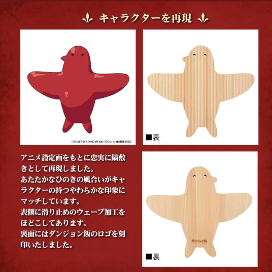 TVアニメ『ダンジョン飯』22話にて登場したマルシルの使い魔を、四万十ひのきを使用した鍋敷きとして再現。