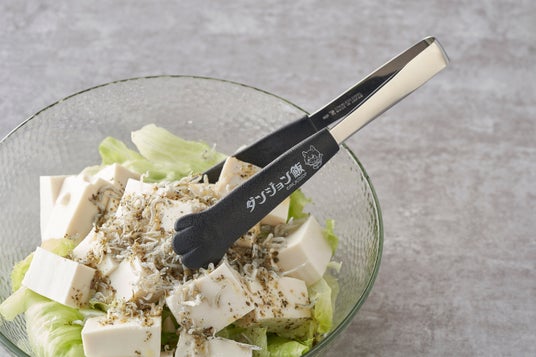 卓上大猫トングの持ち手部分に『ダンジョン飯』ロゴと、イヅツミのプリントを施しました。