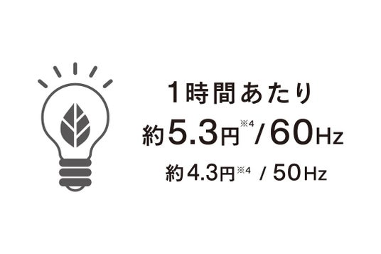 1時間あたり約5.3円※4ヒーターを使用しないコンプレッサー式で消費電力が低いため、1時間あたり約5.3円で使用できます。