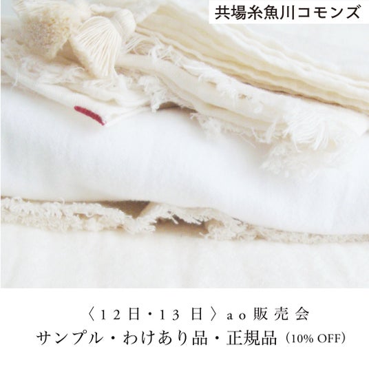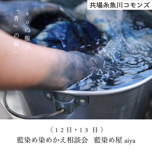 共場糸魚川コモンズでは、aoの新作や定番商品、サンプル品などのアイテムを多数販売、また藍染の染めかえカウンセリングを実施します。2日目は焼き菓子やパンの出店もあります。