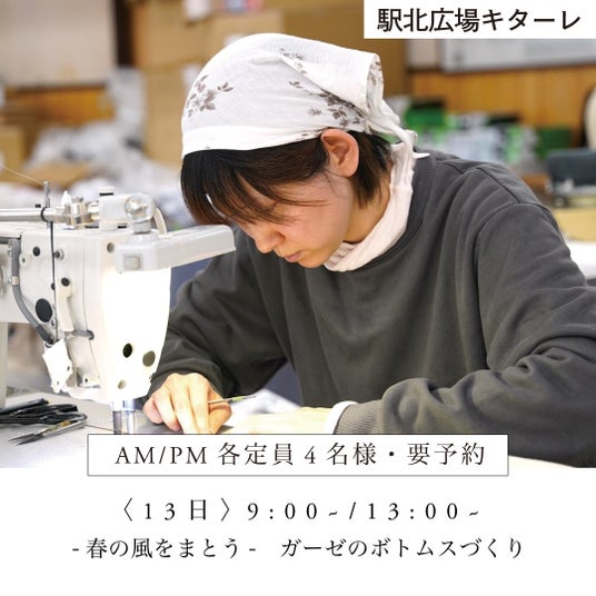 駅北広場キターレでは、aoのガーゼを使ったワークショップ、畑で取れたコットンで糸紡ぎなど、市内外のショップや作家さんと楽しいワークショップを開催します。1日目は南魚沼市から米ぬか玄米カイロのaccos、2日目はaoスタッフによるトークイベントや、工場で使う本格ミシンでボトムスを作るワークショップレッスンも開催します。