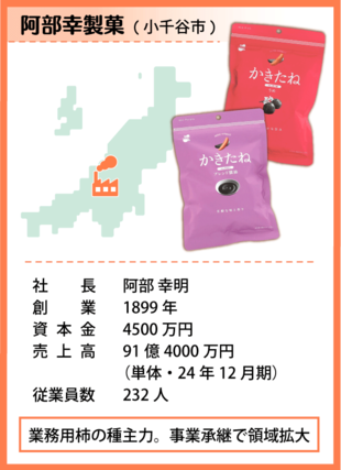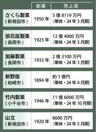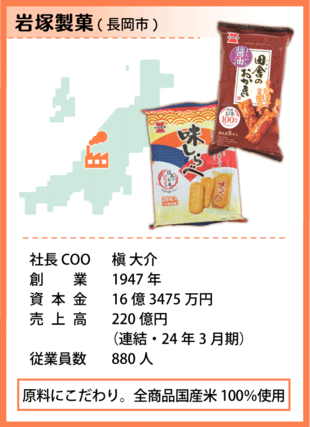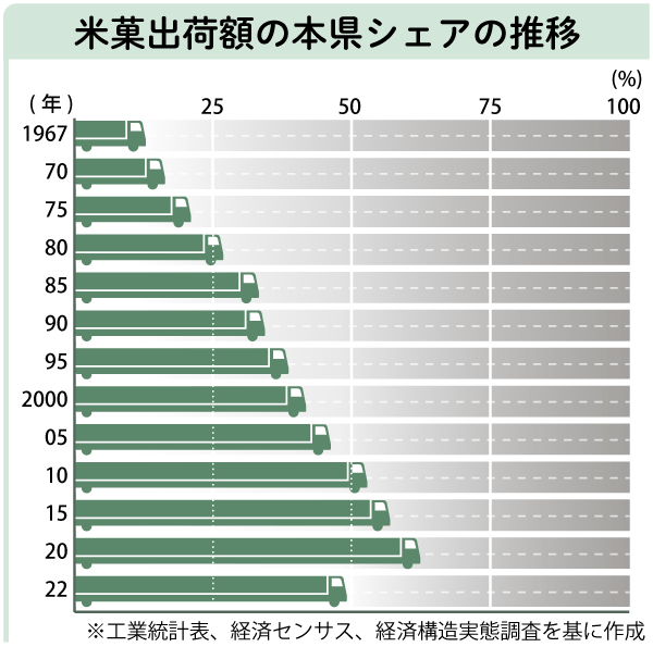米菓全国トップメーカーの亀田製菓(新潟市江南区)をはじめ、現在県米菓工業協同組合に加盟するのは14社。1969年の発足時の3分の1に減ったが、出荷額に占める本県シェアは12%(67年、工業統計表)から49%(2022年、経済構造実態調査)にまで拡大した。