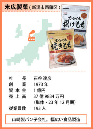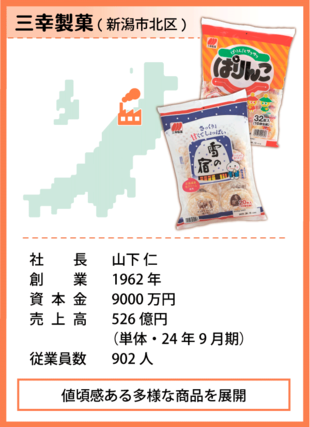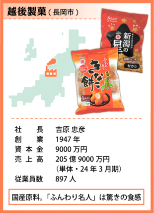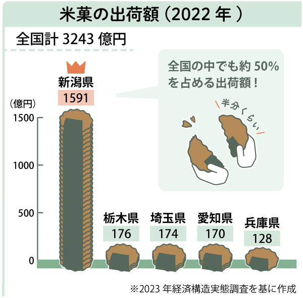 赤ちゃんから高齢者まで楽しめる日本の味、米菓。米どころを背景とした本県メーカーは、業界で「新潟型」と呼ばれるソフトせんべいを武器に全国を席巻し続けている。本県の米菓出荷額は50年以上も全国トップを誇る。