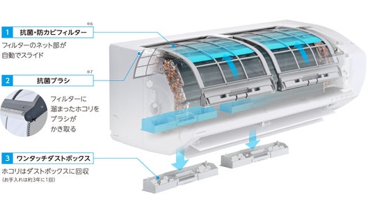 ※3 対象部位:エアフィルター。累計25時間運転の停止後および24時間連続運転すると、自動でフィルターをおそうじします。また、リモコン操作から任意のタイミングでのフィルターおそうじも可能です。