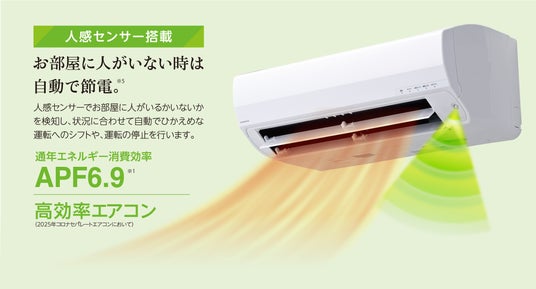 新室外機採用で通年エネルギー消費効率(APF)6.9※1を達成。さらに「人感センサーモード」で電気代の節約に貢献。