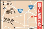 塀にひびが入った被害者宅=三条市興野3(被害者提供)