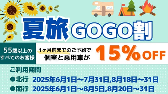 新日本海フェリーは、55歳以上のお客様を対象に個室・乗用車運賃が15%OFFになるおトクな企画商品割引「夏旅GOGO割」の2025年対象期間を発表しました。ご友人やご家族、もちろんお一人旅でも、個室船室でゆっくりと流れる船旅時間をお楽しみください。