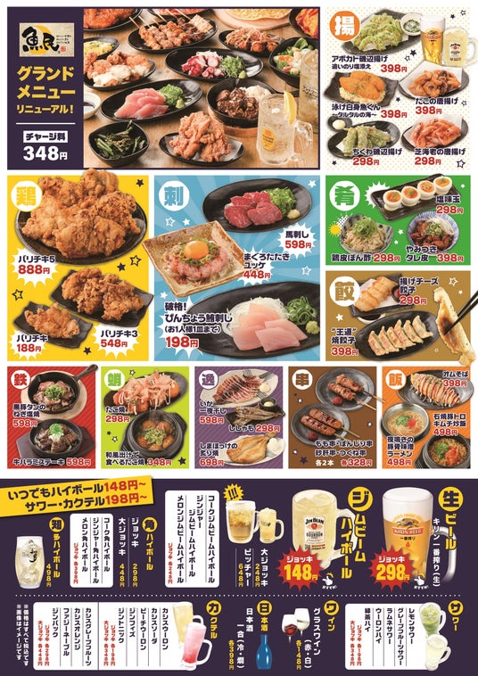 ハイボール148円(税込)~、生ビール298円(税込)など驚愕のバリヤス価格でコスパ抜群!グランドメニューリニューアルを記念し、4月15日から4日間の記念セールを開催いたします。