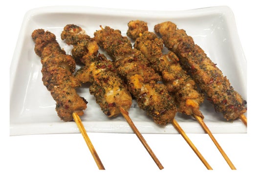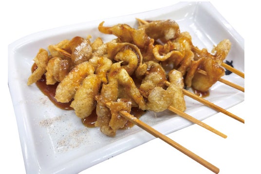 鶏皮パリパリ揚げ串 1本99円(税込)パリパリに揚げた鶏皮を特製の甘だれとスパイスで仕上げました。