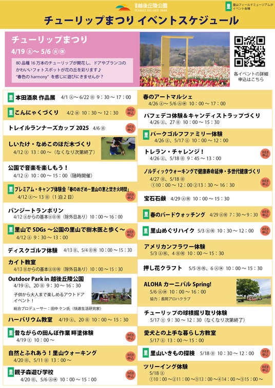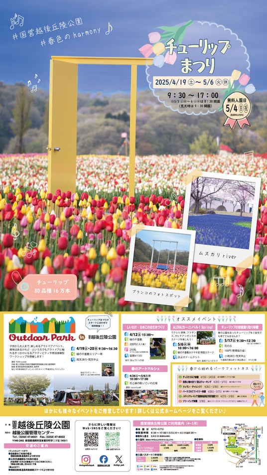 国営越後丘陵公園(新潟県長岡市)では、4月19日(土)~5月6日(火休)にチューリップまつりを開催します。