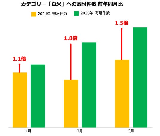 2024年と2025年の1月~3月における、「ふるなび」内のカテゴリー「白米」への寄附件数を比較したところ、すべての月で前年を上回り、最大で前年同月比1.8倍にまで増えていることがわかりました。
