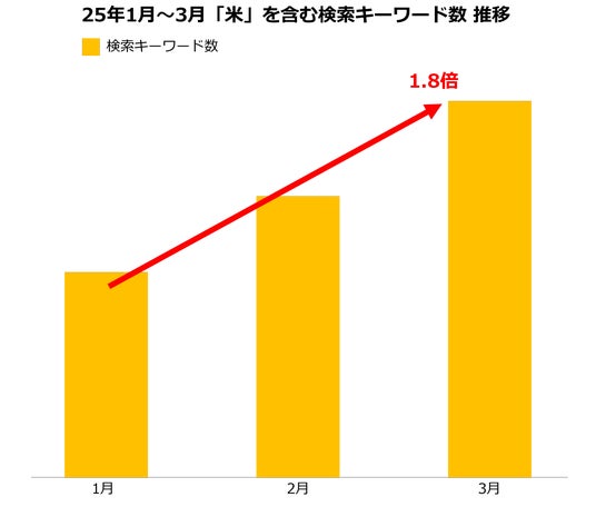 検索キーワードの結果からも、“お米人気”の高まりが顕著に表れました。2025年1月~3月にかけて「米」を含む検索キーワード数を調べたところ、3月の検索数は1月と比較して約1.8倍に達し、関心の高まりが伺えました。