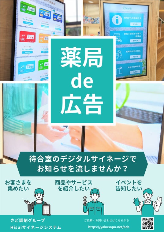 薬局内に設置されたデジタルサイネージを通じて地域のお知らせを発信し、多くの方が訪れる薬局を地域情報発信の拠点といたします。地域経済の活性化に寄与します。