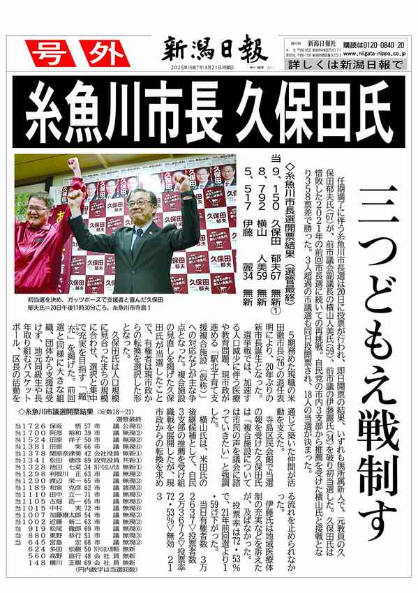 【号外】糸魚川市長に久保田氏 2025/4/21 1:10 (最終更新: 2025/4/21 1:16) PDFで号外を見る トップページで最新情報を見る 関連ニュース 【号外】新潟県知事が柏崎刈羽原発再稼働を容認 11/21 【号外】日経平均初の5万円台 10/27 【号外】新首相に高市早苗氏、女性で初めて選出 10/21 【号外】燕市の新市長に前市議の佐野大輔氏 10/20 【号外】北信越高校野球・帝京長岡が優勝 10/19 【号外】公明党が連立政権離脱へ 10/10 【号外】ガザ全人質解放へ 10/9 【号外】ノーベル化学賞に北川進京都大特別教授 10/8 ノーベル化学賞に京都大特別教授の北川進氏ら 10/8 【号外】ノーベル生理学・医学賞に大阪大栄誉教授の坂口志文氏ら3氏 10/6 【号外】自民党新総裁に高市早苗氏 10/4 【号外】石破茂首相が辞任の意向 9/7