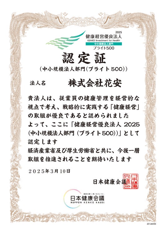 株式会社花安(本社:新潟県新発田市、代表取締役:渡辺安之)は、2024年3月10日(月)に健康経営優良法人2025(中小規模法人部門)に認定されました。健康経営優良法人の中でも優れた取り組みを行った中小規模法人として「ブライト500」に認定されたことをお知らせします。