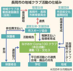 長岡市の公立中学校の休日部活動に代わり、9月に立ち上がる地域クラブ活動の概要が固まった。月4回程度の開催で、参加費は月額3960円。運動13、文化3の活動を始め、約110クラブの開設を予定している。愛称は「ながおかCome100クラブ」とした。5月に仮申し込みを受け付ける。市教育委員会は「文化やスポーツを体験する場として活用してほしい」と呼びかける。