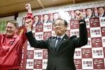 糸魚川市長選で初当選し、拳を握って喜ぶ久保田郁夫さん=20日、糸魚川市寺島1