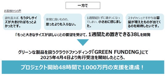 “もっと大容量が欲しい”という消費者の声を受け約2倍38L容量を開発し、クラファンでの反響を受け、一般販売実現!