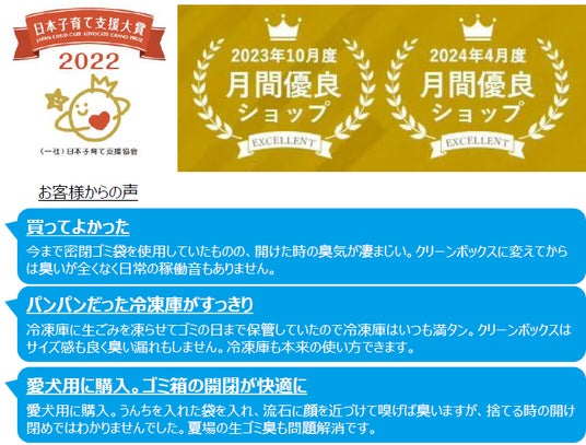 支援大賞2022」(一社 子育て支援協会)企業部門受賞。さらに、楽天市場では、上位1%のショップしか選ばれない「月間優良ショップ」に、2023年10月度、2024年4月度の2回受賞、という栄誉をいただきました。