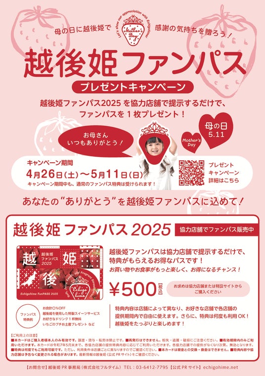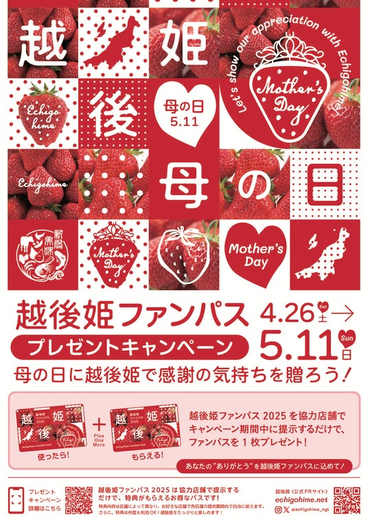新潟県では、新潟県産いちご「越後姫」の魅力を通して、大切な人に感謝の気持ちを伝えることを目的に、母の日キャンペーンを開催いたします。本キャンペーンは「越後姫ファンパス2025」と連動した店頭での特典プレゼント企画と、SNSで参加できる投稿キャンペーンの2つの柱で展開いたします。