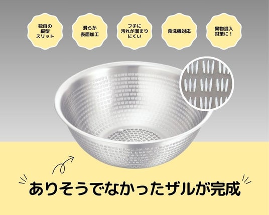 本製品は一体成型でフチ部分も汚れが溜まりにくく、衛生的な使用が可能で、18-8ステンレス素材の採用により、耐久性も抜群です。米とぎ、麺の湯切り、さらには食材の洗浄など、あらゆる用途に対応できる万能アイテムです。