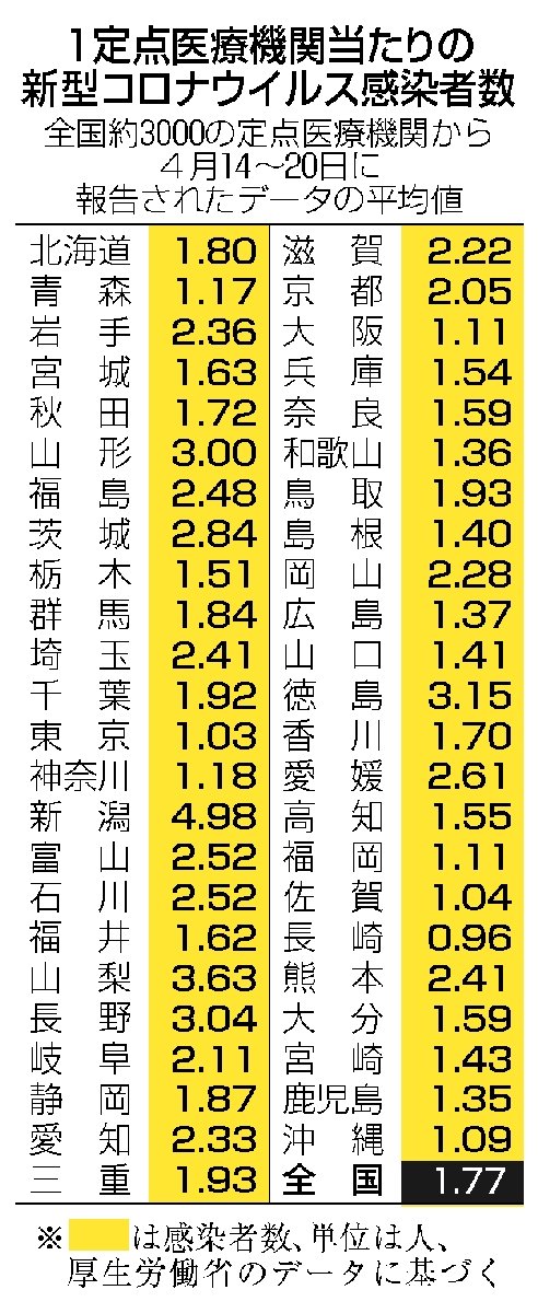 36都道府県で減った。1機関当たりの感染者数が多かったのは新潟4・98人、山梨3・63人、徳島3・15人。少なかったのは長崎0・96人、東京1・03人、佐賀1・04人などだった。