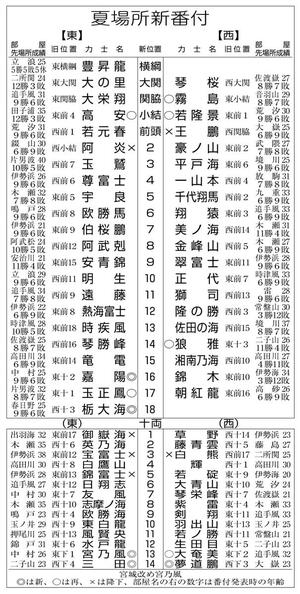 スポーツ 相撲 [大相撲]大の里は東大関で綱とり、嘉陽は新入幕 新潟・海洋高校出身の2人が勝負の夏場所へ 番付発表 2025/4/28 23:10 (最終更新: 2025/4/28 23:34) 日本相撲協会は28日、大相撲夏場所(5月11日初日・両国国技館)の番付を発表し、春場所で3度目の優勝を遂げた大関大の里(新潟・海洋高校出身)は、東の正位から初の綱とりに挑む。初土俵から所要13場所で... 残り653文字(全文:753文字) ここから先を読むには 続きを読む(会員登録する) 続きを読む(ログイン) 新潟日報朝刊を購読していますか? はい いいえ トップページで最新情報を見る 関連ニュース [大相撲]大の里(新潟・海洋高校出身)「結果でファンを喜ばせ... 4/27 [大相撲]大の里(新潟・海洋高校出身)優勝から一夜明け会見、... 3/24 やったー!歓喜の新潟糸魚川 大相撲3度目V大の里、母校・海洋... 3/24 [大相撲・春場所千秋楽]大関大の里(新潟・海洋高校出身)3度... 3/23 [大相撲九州場所・番付発表]安青錦がウクライナ出身初の関脇に... 10/27 [大相撲九州場所]24歳の欧勝海(海洋高出)、先輩大の里追い... 10/27 [大相撲ロンドン公演]横綱大の里(海洋高校出身)白星発進!豪... 10/16 [大相撲]第65代横綱の貴乃花光司さんインタビュー「大の里(... 10/16 [大相撲ロンドン公演特集]横綱大の里(海洋高出)が英国進出⁉... 10/13 [大相撲]横綱初制覇の大の里(海洋高校出身)一夜明け会見「今... 9/29 「感動した」「こんなにうれしいことない」…大の里の横綱初Vに... 9/28 [大相撲秋場所千秋楽]大の里(海洋高出)、豊昇龍との決定戦制... 9/28