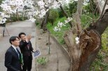 米ワシントンへの出発前に記者会見する(前列左から)被害者家族会の横田拓也さん、古屋元拉致問題相、飯塚耕一郎さんら=29日午前、羽田空港