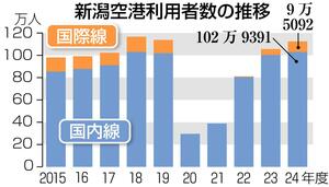県は1日、2024年度の新潟空港の利用者数が前年度比6・5%増の112万4483人だったと発表した。110万人を超えたのは19年度以来5年ぶりで、新潟空港を拠点とする航空会社「トキエア」の仙台線など国内線の新規路線就航や、国際線の通年運航などが利用者を押し上げた。新型コロナウイルス禍以前の19年度比では98・8%となり同水準までほぼ回復した。