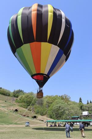 上越市大貫の金谷山公園で、熱気球を楽しむイベントが開かれた。青空の下、親子連れらが熱気球から新緑の景色を眺め、つかの間の「空中散歩」を堪能した。