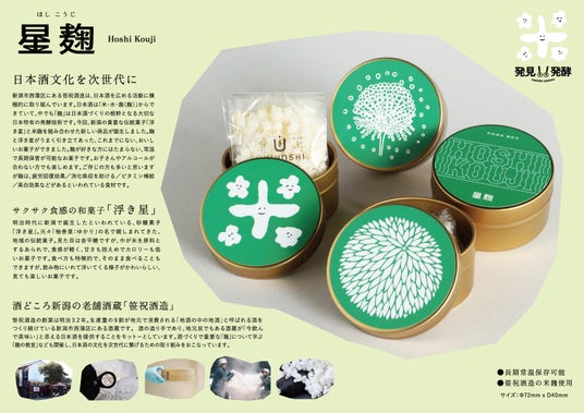 新潟の貴重な伝統菓子「浮き星」と米麹を組み合わせた新しい商品「星麹:ほしこうじ」。麹と浮き星がうまく引き立てあった、これまでにない、おいしいお菓子です。麹を作っているのは、新潟市西蒲区にある笹祝酒造。日本酒を広める活動に積極的に取り組んでいる老舗酒蔵です。日本酒は「米・水・菌(麹)」からできていて、中でも「麹」は日本酒づくりの根幹となる大切な日本特有の発酵技術です。星麹は麹が好きな方にはたまらない、常温で長期保管が可能なお菓子となりました。お子さんやアルコールが合わない方でも日本酒づくりの過程や文化を感じることができるお菓子となればと考えています。素朴な甘さが親しみをもつきっかけになると幸いです。
