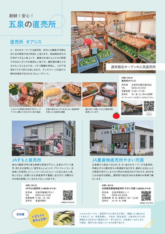 ・週末限定オープンの直売所「オアシス」では、五泉産の新鮮野菜や特産品を販売。・五泉ブランドのれんこん「五泉美人」を使ったご当地コロッケなど、地元グルメも盛りだくさん!