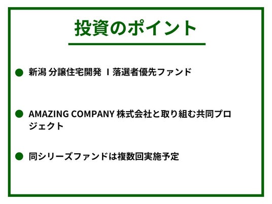 本ファンドは、AMAZING COMPANY株式会社と連携しプロジェクトを進めている新潟 分譲住宅開発シリーズの第三弾となります。